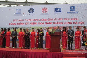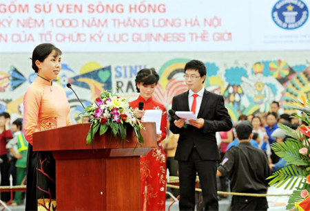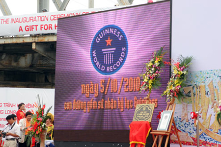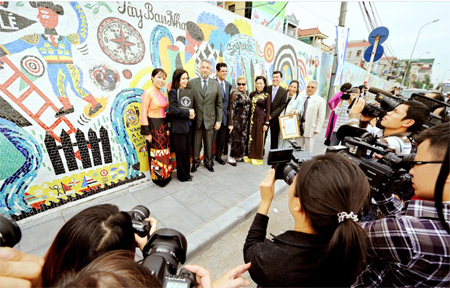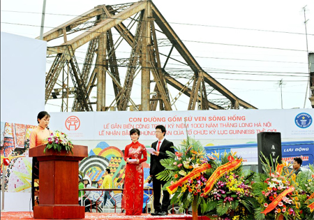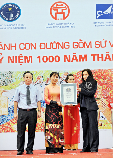 A 810m section of Hanoi’s ceramic mosaic along the Red River road has set a new Guinness World Record. Beatriz Fernandez, a representative from the Guinness Book of World Records, presented the city with a certificate for the largest ceramic mosaic at a ceremony in Hanoi on October 5, when a plaque with “in celebration of Thang Long-Hanoi’s millennium anniversary”, was placed on the mural.